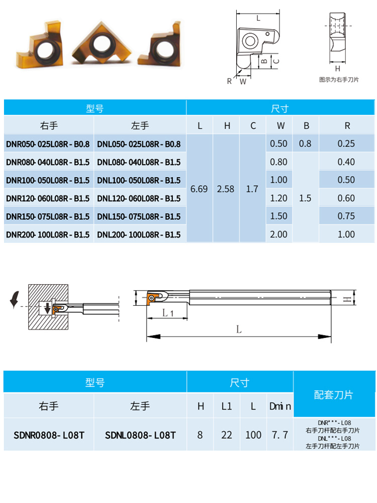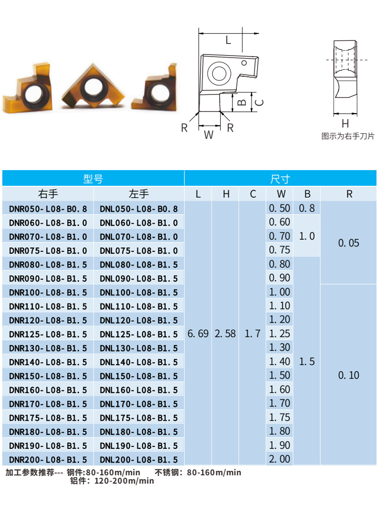 DN-L08系列等同GER-A系列內(nèi)孔割槽刀,8mm孔徑內(nèi)孔切槽刀切深1.5mm,平口 槽寬0. 50 0. 60 0. 70 0. 75 0. 80 0. 90 1. 00 1. 10 1. 20 1. 25 1. 30 1. 40 1. 50 1. 60 1. 70 1. 75 1. 80 1. 90 2. 00mm,圓弧槽R0.25 0.40 0.50 0.60 0.75 1.00MM??杉庸げ讳P鋼、鋼件。 加工參數(shù)推薦--- 鋼件:80-160m/min 不銹鋼:80-160m/min, 鋁件:120-200m/min。
