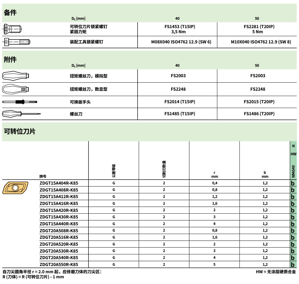 自刀尖圓角半徑 r = 2.0 mm 起,應(yīng)修磨刀體的刀尖區(qū):R (刀體) = R (可轉(zhuǎn)位刀片) - 1 mm