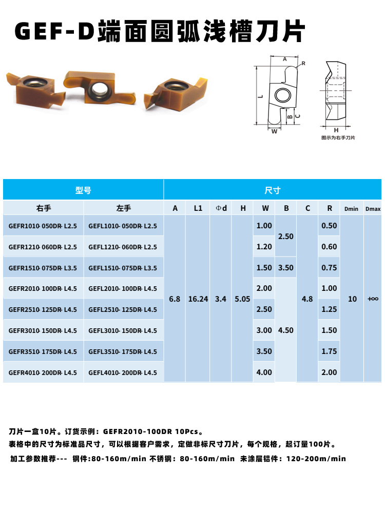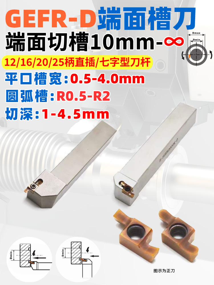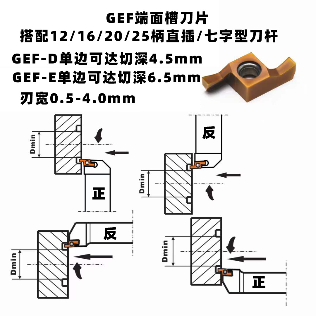GEF端面槽刀片,GEF-D單邊Z大切深4.5MM,切槽范圍10mm往上無(wú)限制。端面環(huán)槽刀片槽寬可選0.50 0.70 0.80 1.00 1.20 1.50 1.70 1.80 2.00 2.30 2.50 3.00 3.50 4.00mm。端面圓弧槽刀片R角有,R0.50,R0.60 ,R0.75,R1.00,R1.25,R1.50,R1.75,R2.0。