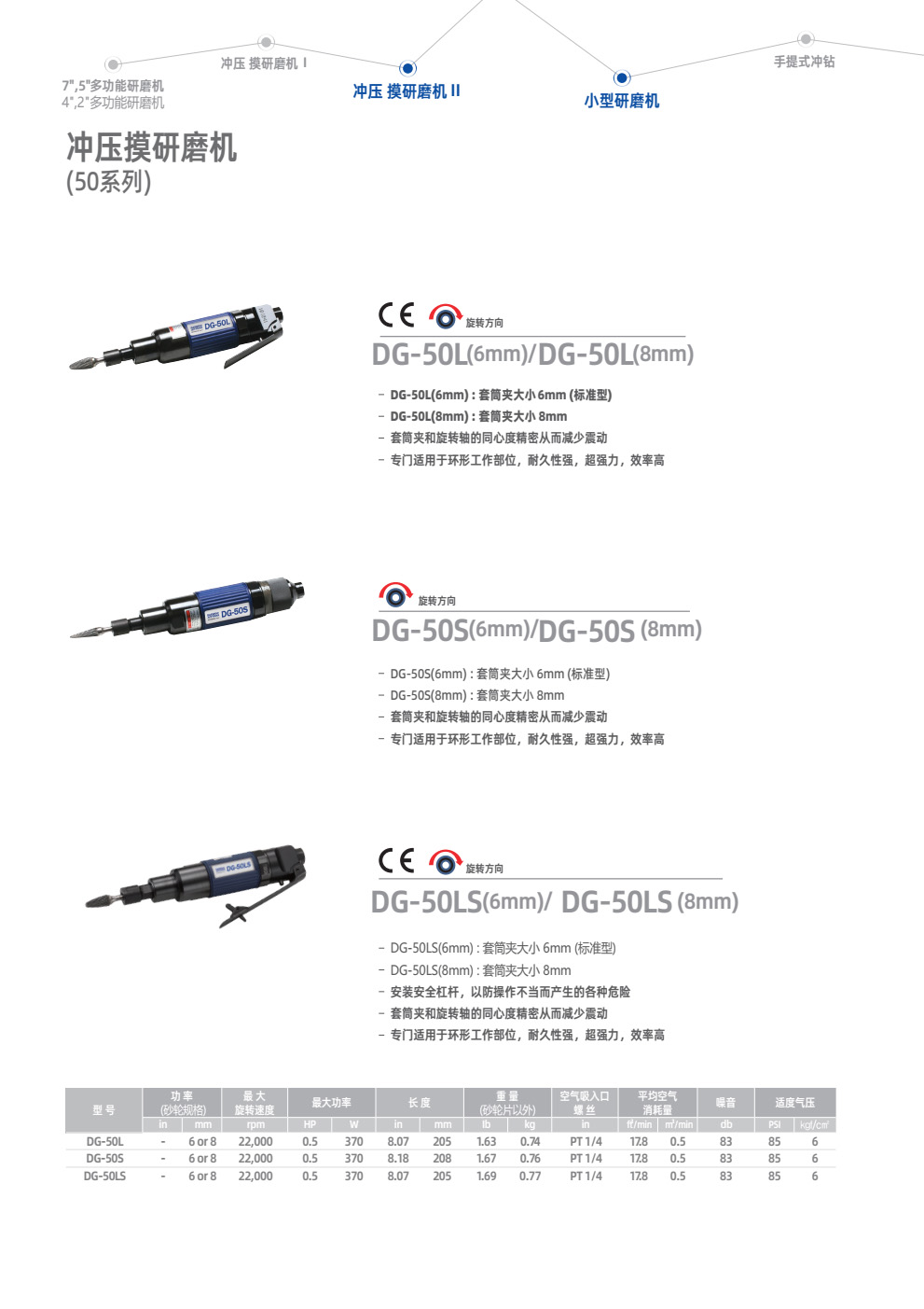 DAEWOO AIR TOOLS沖壓模研磨機Ⅱ(標(biāo)準(zhǔn)型 / 長類型 / 50系列) 輕量、小型設(shè)計,相比本身重量力強。適用于沖模、調(diào)試、焊接規(guī)模作業(yè)上效果佳。低噪音、長類型等多種類結(jié)構(gòu),按需求可自行挑選使用。