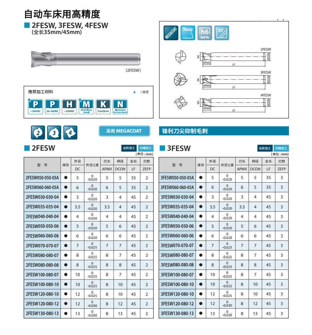 3刃自動(dòng)車床用涂層銑刀3FESW系列全長(zhǎng)35/45mm,鋒利切削刃螺旋角35度,可加工HRC30-40鋼件、hrc55度淬火鋼、不銹鋼、鑄鐵、鋁合金。