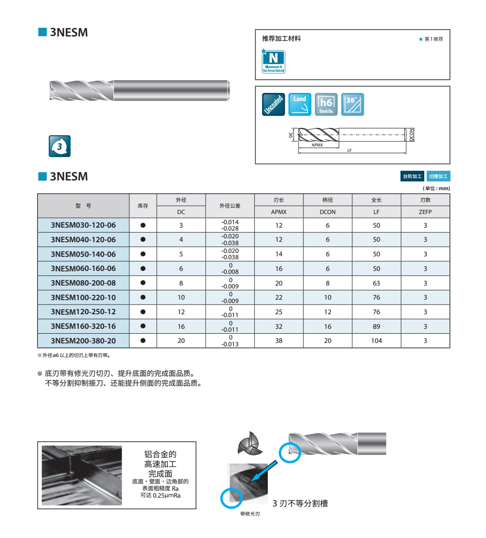 3不等齒距3NESM鋁合金立銑刀,底刃帶有修光刃切刃、提升底面的完成面品質(zhì)。不等分割抑制振刀、還能提升側(cè)面的完成面品質(zhì)。外徑D6以上的切刃上帶有刃帶。鋁合金的高速加工完成面底面·壁面·邊角部的表面粗糙度 Ra可達(dá)0.25um