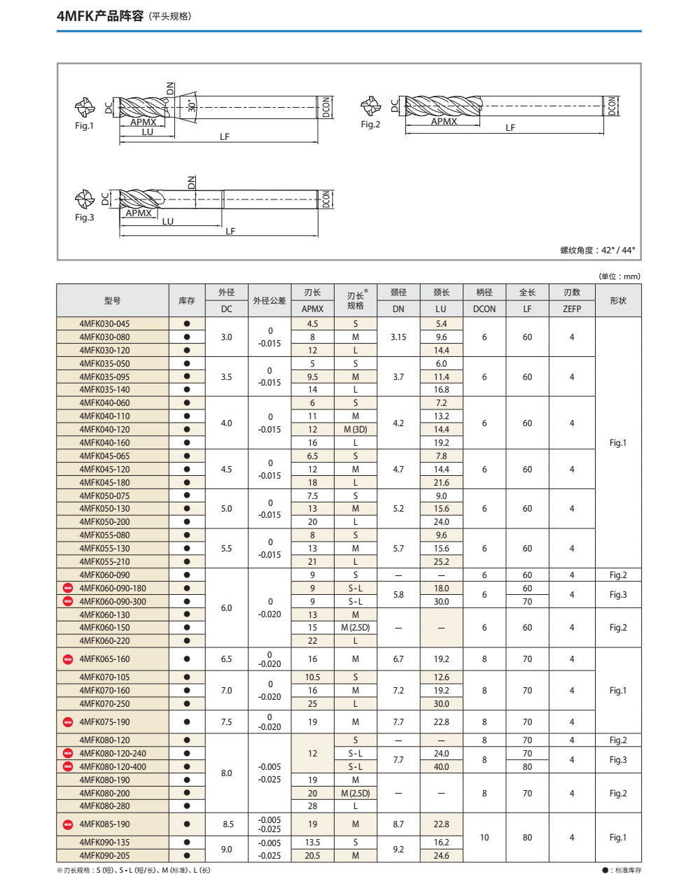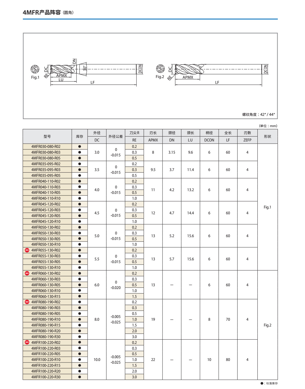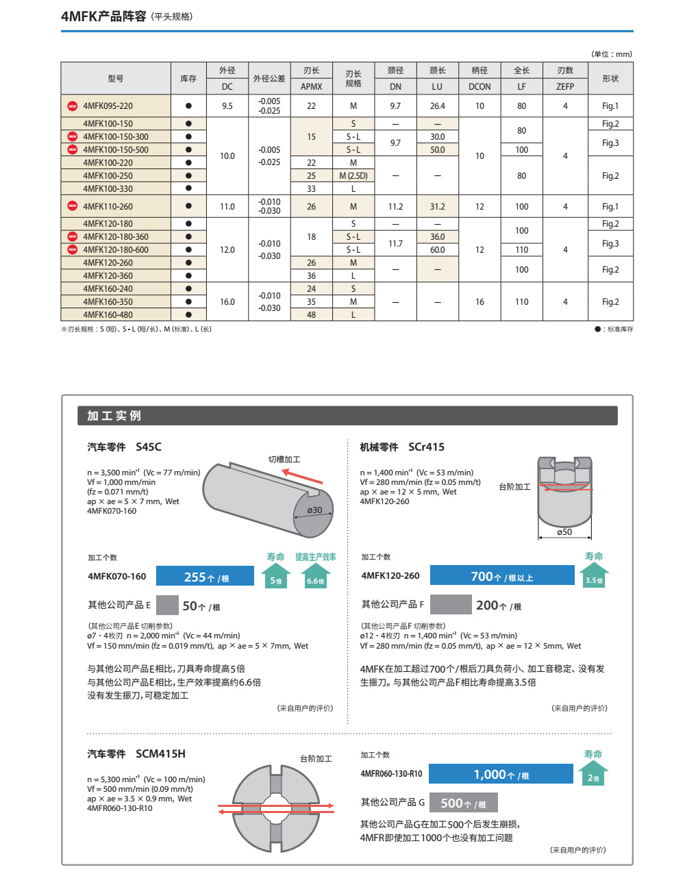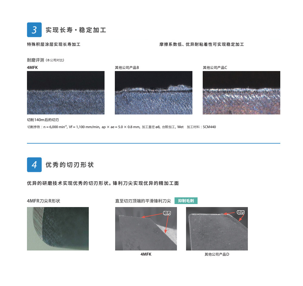 鋼件高速銑削、特殊不等分割不等導(dǎo)程設(shè)計,實現(xiàn)良好抗振性能。新型特殊切削形狀實現(xiàn)穩(wěn)定切削排出性能。直角型4MFK和圓角型4MFR型