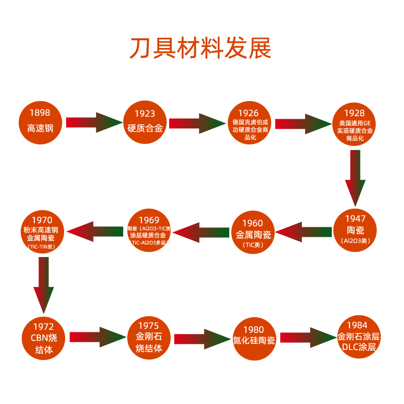 隨著人類(lèi)社會(huì)的進(jìn)步,切削工具也在不斷的發(fā)展和演化,然而,人們?nèi)匀幻媾R著一個(gè)很大的問(wèn)題,那就是還沒(méi)有一種硬度比鐵更高、能夠用來(lái)加工鐵材料的金屬。直到1898年, 一種比鐵更硬的金屬--“高速工具鋼(也稱(chēng)為高速鋼)”的出現(xiàn),才使這一問(wèn)題得到了解決。同時(shí),這種新材料的發(fā)明也使得用于鐵材料加工的切削工具得到了飛速的發(fā)展。 進(jìn)入二十世紀(jì)20年代后,德國(guó)人又發(fā)明了硬度遠(yuǎn)遠(yuǎn)超過(guò)高速工具鋼的“硬質(zhì)合金”。今天的硬質(zhì)合金技術(shù)的基礎(chǔ),就是由德國(guó)科學(xué)家施勒特爾博士確立的。