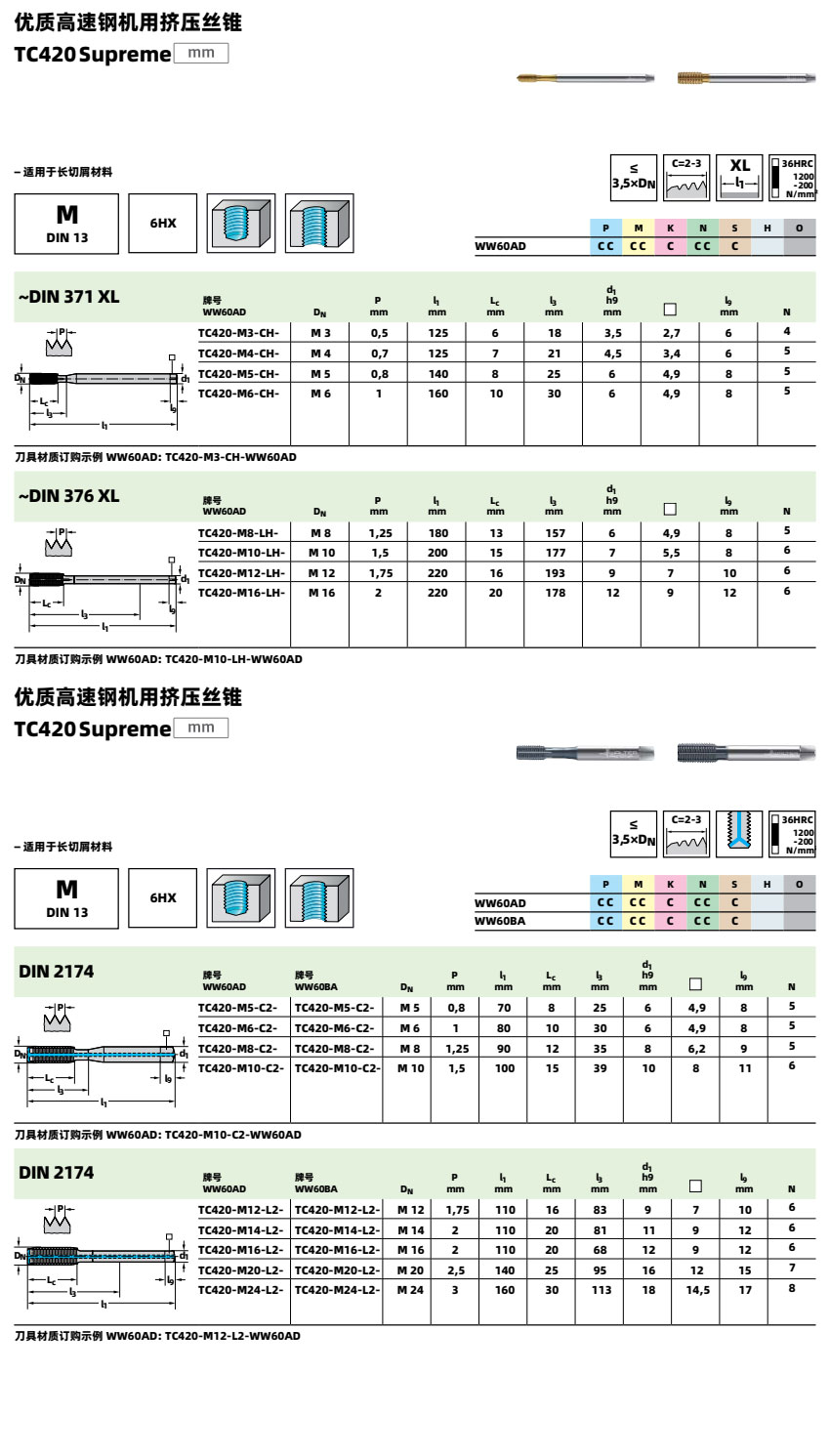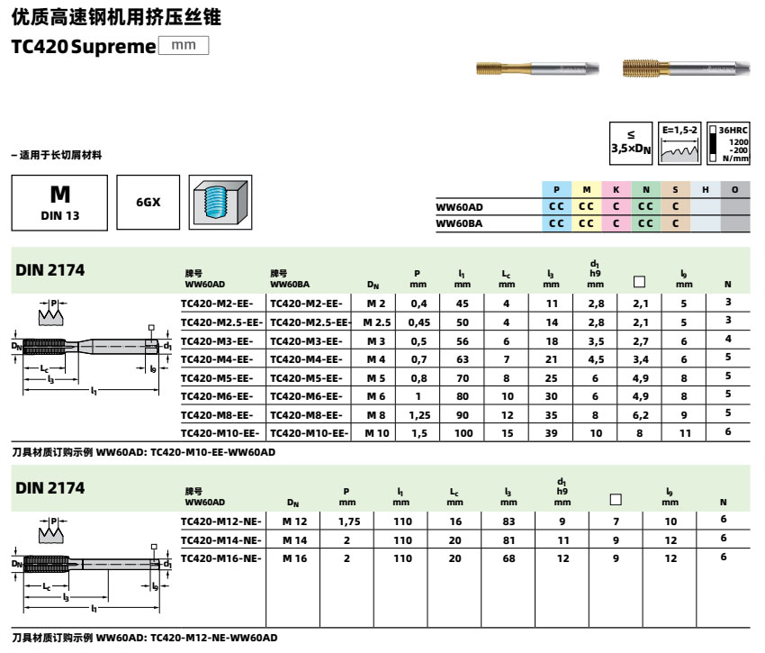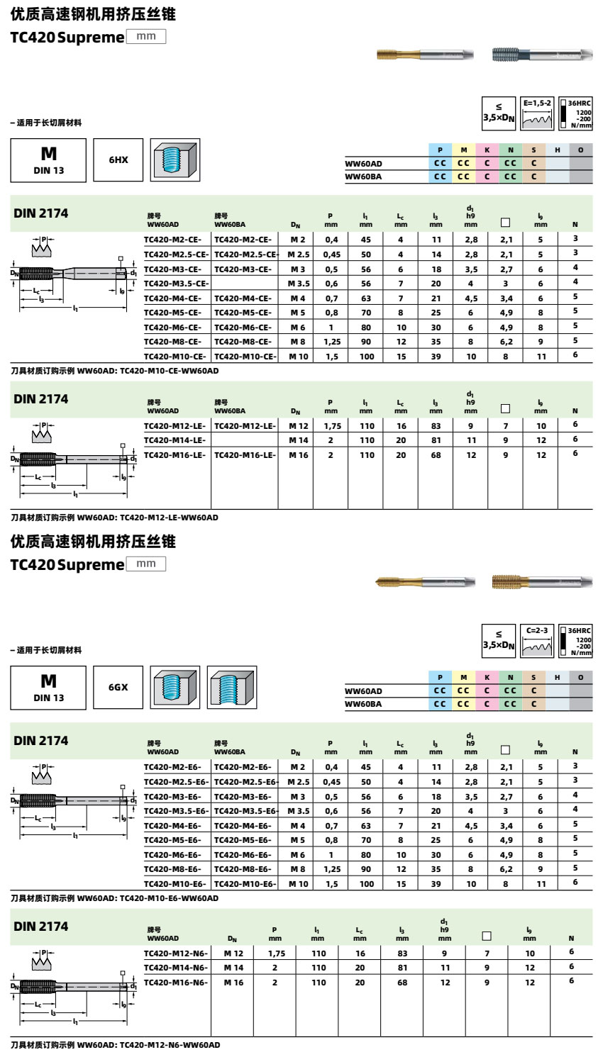高速鋼機(jī)用擠壓絲錐 TC420 適合加工HRC36以下鋼件、不銹鋼、鋁合金、鑄鐵