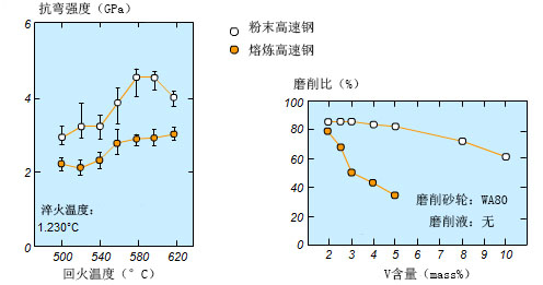 粉末高速鋼的成分、制造方法及組織有如下特點(diǎn)。 - 結(jié)晶粒子直徑比熔煉高速鋼的細(xì)小,因而韌性優(yōu)異(左圖)。 - 磨削性比熔煉高速鋼好(右圖)。 - 可以用它制造熔煉高速鋼無法制造的合金元素含量較高的商品。