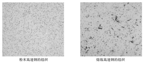下面的照片分別是粉末高速鋼與熔煉高速鋼的組織。黑點(diǎn)表示碳化物,粉末高速鋼的碳化物比熔煉高速鋼的要細(xì)小,并且分布均一。白色部分是非常堅(jiān)硬的組織,稱為馬氏體。細(xì)小的碳化物會阻止結(jié)晶粒子的成長,因此粉末高速鋼的馬氏體結(jié)晶粒子比熔煉高速鋼的小。