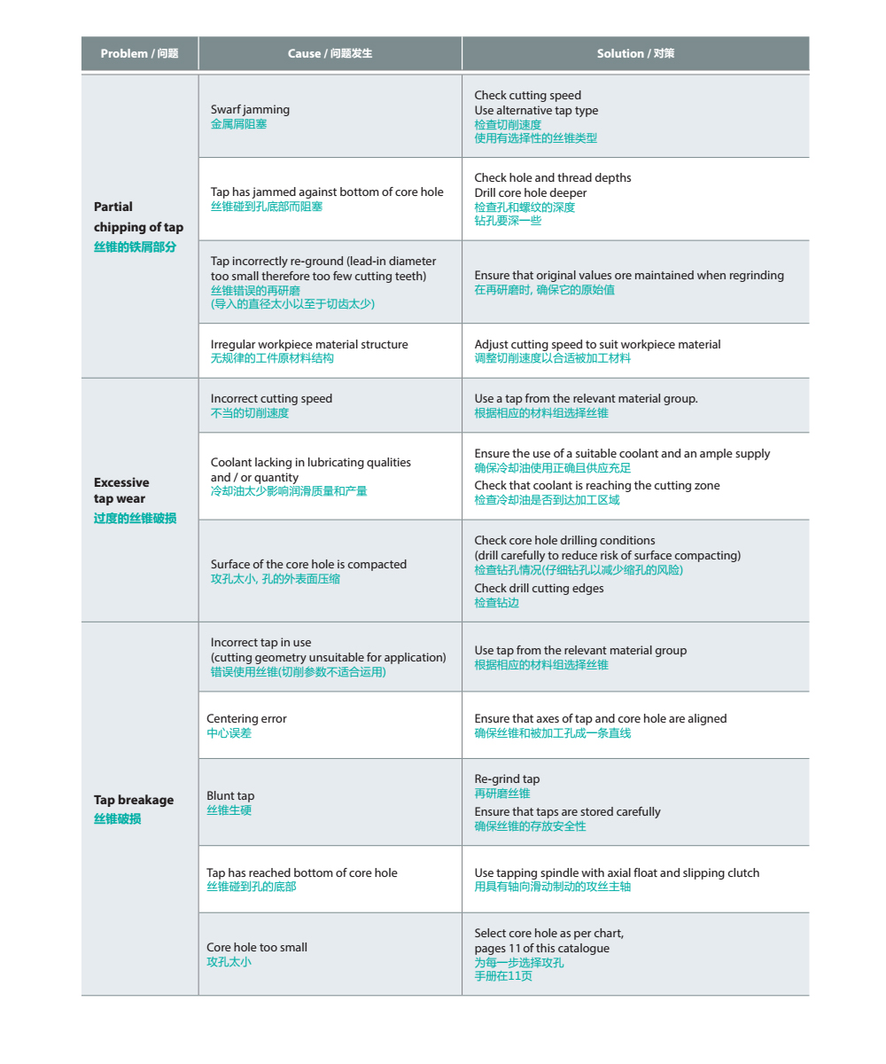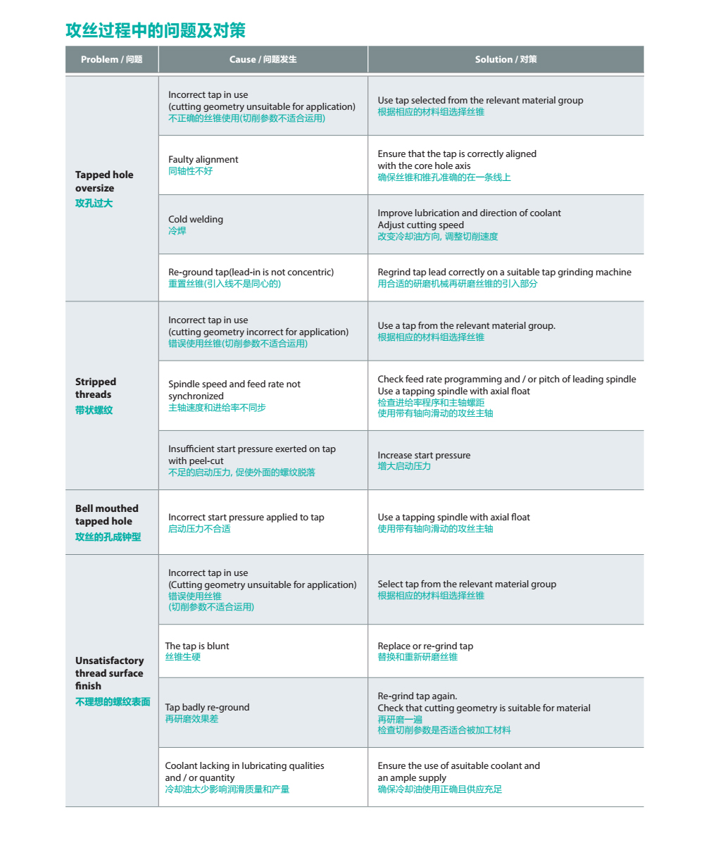 1.金屬屑阻塞,解決辦法:檢查切削速度,使用有選擇性的絲錐類型。